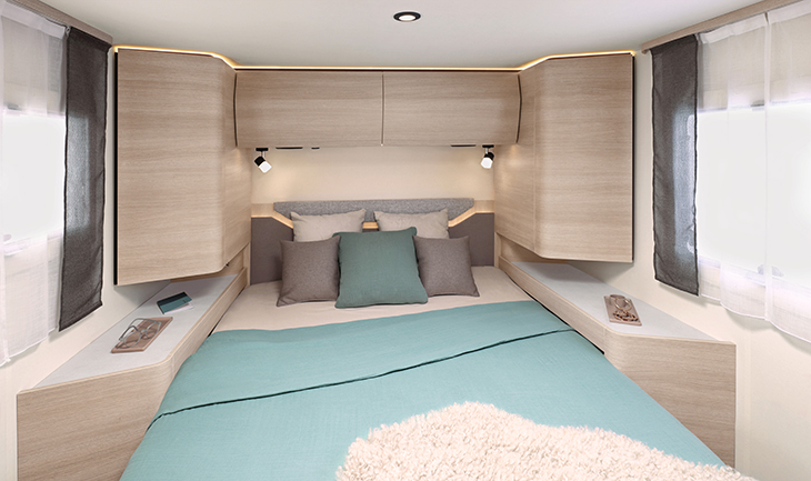 Zoals de naam al doet vermoeden is klauteren er niet bij als je een queensbed in je camper of caravan hebt. Een queensbed is een vrijstaand tweepersoonsbed, waar je vanaf twee zijkanten – en de achterkant – in kunt stappen. Dit type bed neemt relatief veel ruimte in beslag, waardoor je het vooral terugziet in de wat grotere en luxere campers en caravans.