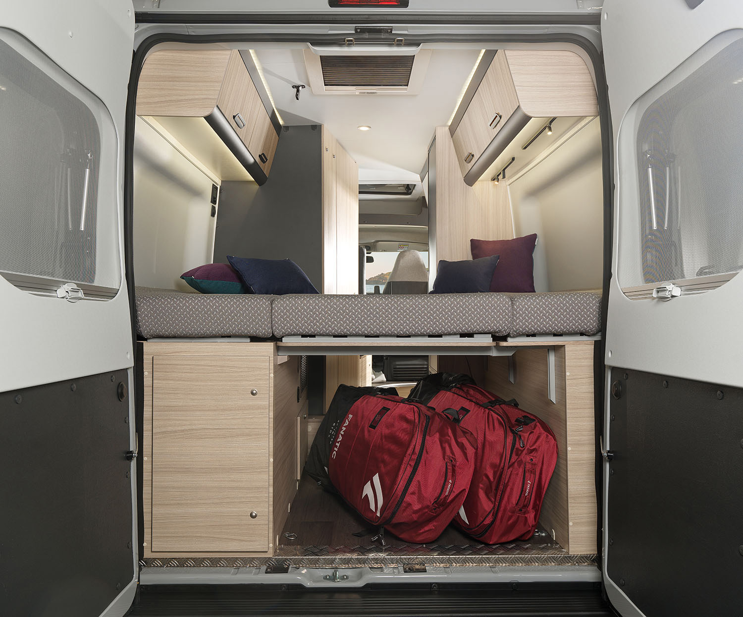 Het tweepersoonsdwarsbed achterin de Sun Living V 60SP TentTop is gedeeltelijk op te klappen. Zo komt er ruimte vrij voor bijvoorbeeld fietsen. Met de sjorogen op de bodemplaat zijn ze goed te verankeren. Ook wanneer het bed is neergeklapt is er nog ruimte voor bagage.