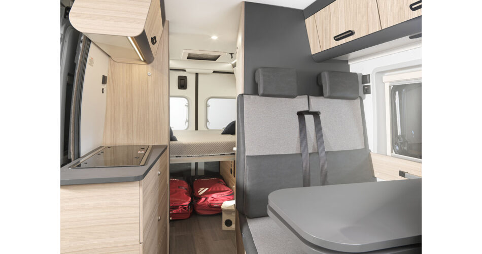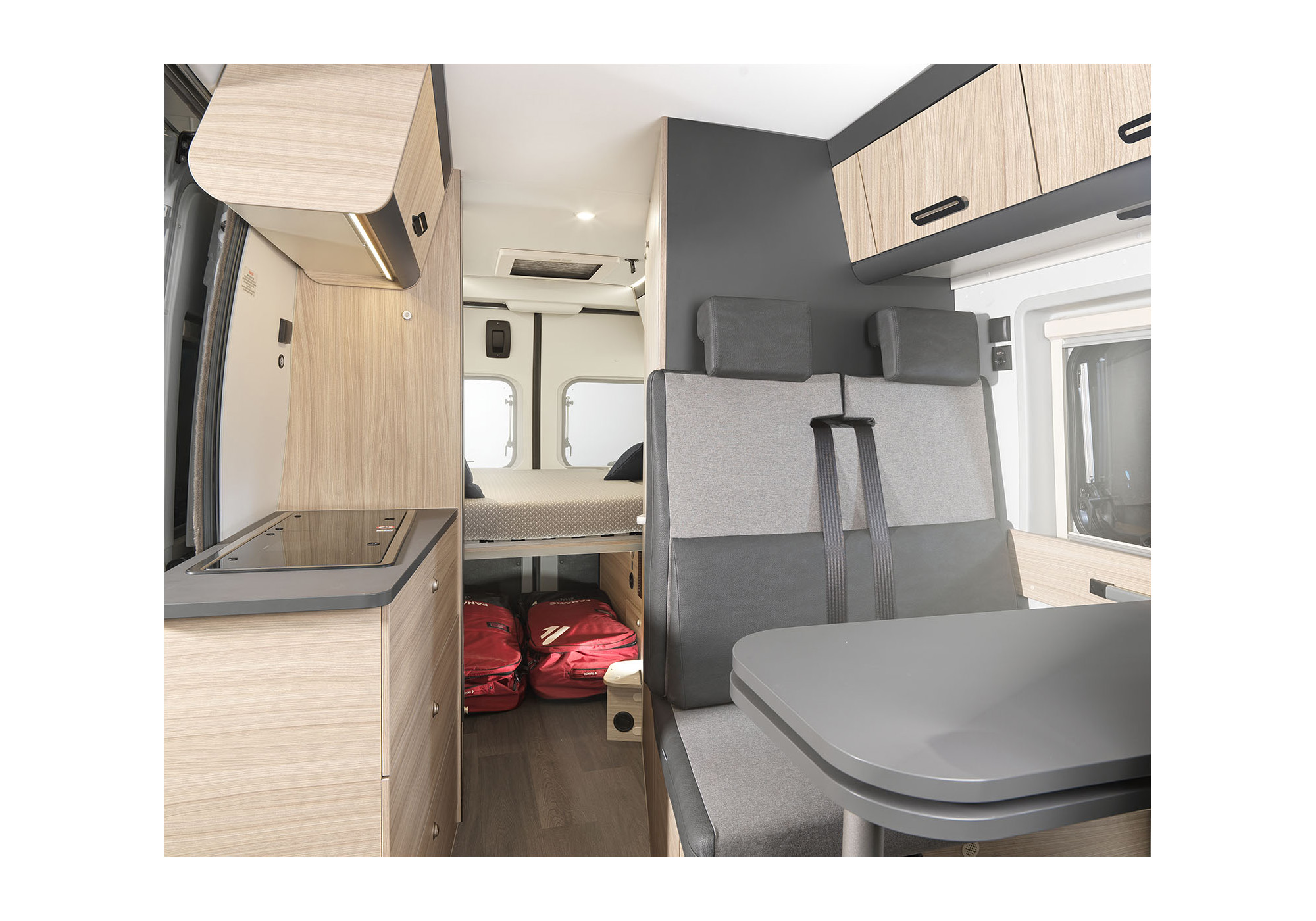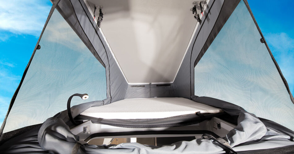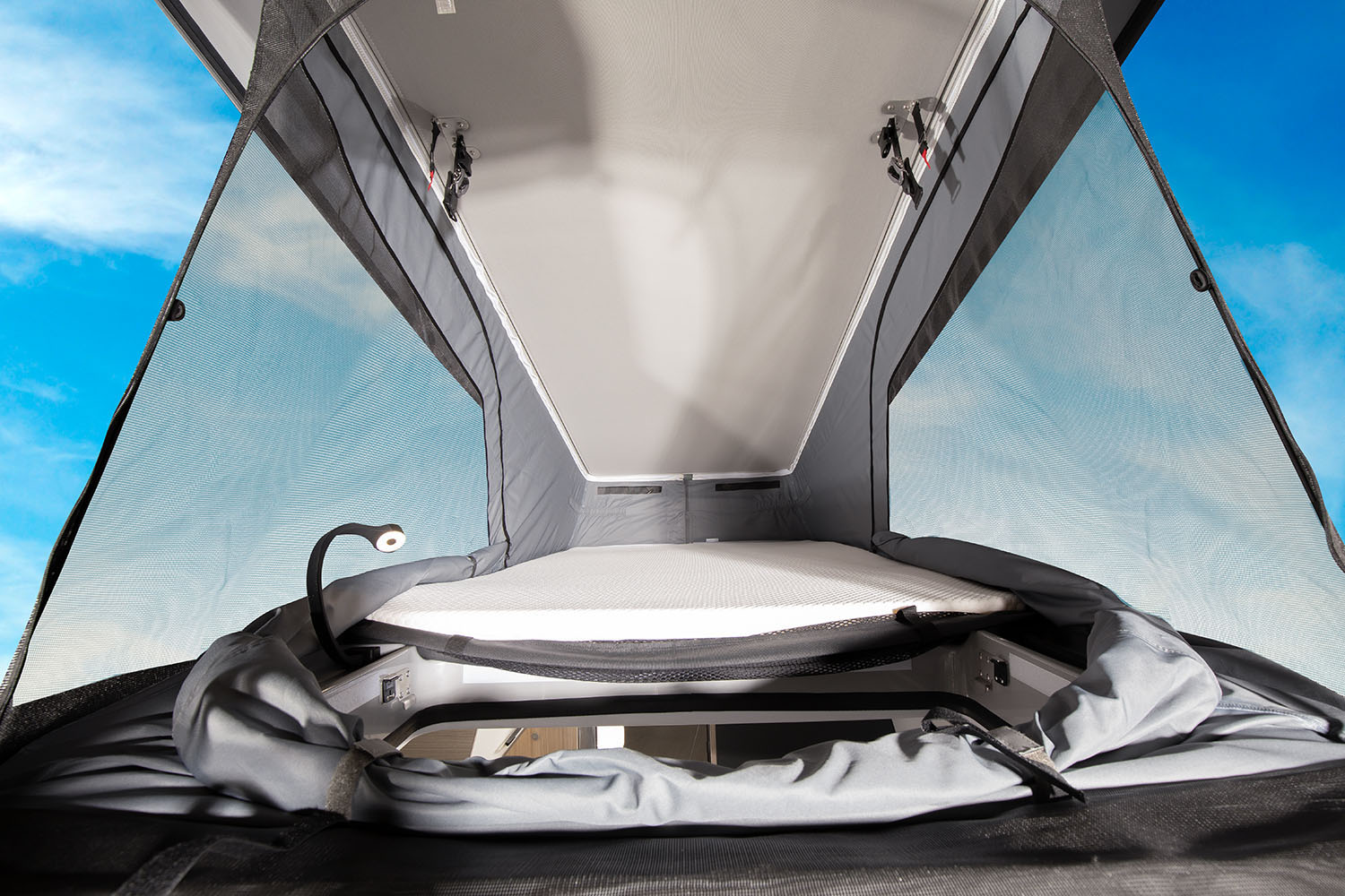 Het kan zijn dat de naam van de buscamper je bekend voor komt. In 2020 bracht Sun Living dit model namelijk uit als V60 SP Family. In die uitvoering heeft de buscamper eveneens ruimte voor vier personen, wat is te danken aan de twee tweepersoonsbedden achterin. Eentje daarvan is bij de TentTop-uitvoering verdwenen. In het slaaphefdak kunnen nu immers twee personen overnachten. Het bed is bereikbaar via een ladder. Het pop-updak is voorzien van een zwanenhalslampje en het doek – uitgerust met een insectenhor – is vrijwel helemaal open te ritsen voor een optimale buitenbeleving.