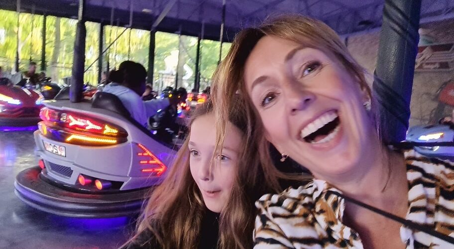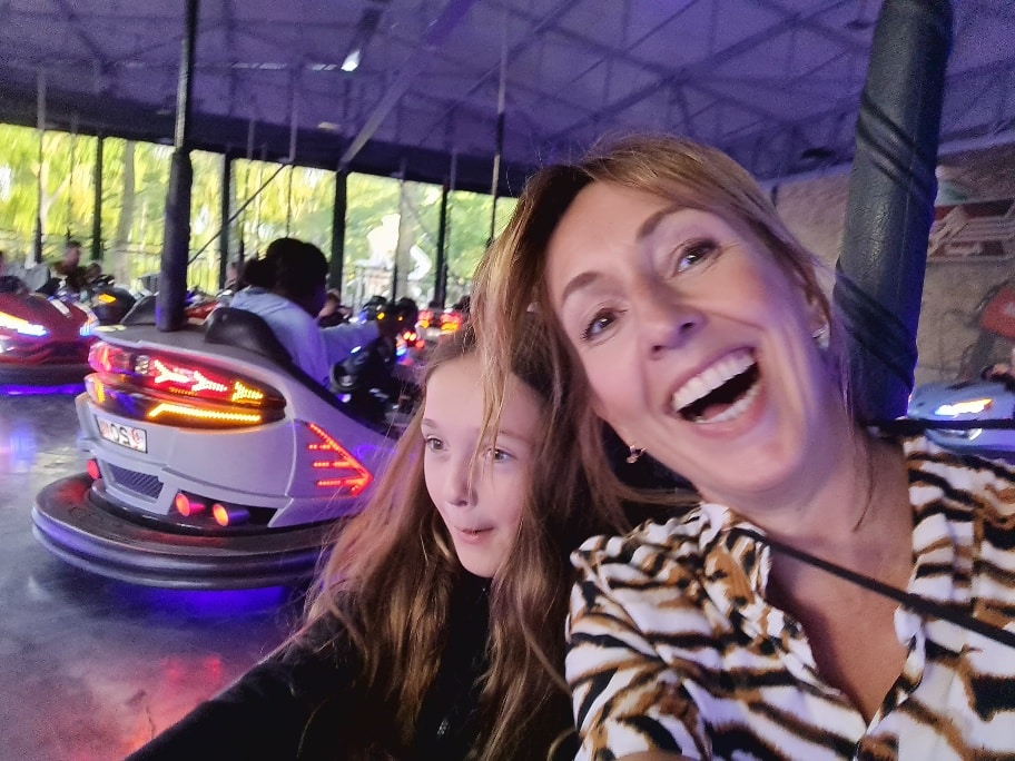 Een weekendje kamperen vindt mijn kroost al leuk. Maar als er niet alleen een speeltuin is, maar ook achtbanen en een rodelbaan, dan is het helemaal een feest. Wat ik me nooit had gerealiseerd is dat het attractiepark ook na sluitingstijd toegankelijk is voor kampeerders en gasten van het vakantiepark. De attracties waren weliswaar gesloten, maar om bij de speeltuin te komen loop je gewoon door het park. En waar kwam toch dat belletje vandaan? Toch maar eens kijken, en wat bleek? De botsauto’s waren even geopend. Hoe tof is het om na sluitingstijd nog even te racen? Die van mij vonden het super. En eerlijk is eerlijk, ook ik kon het niet laten even een ritje te maken.