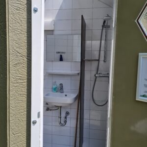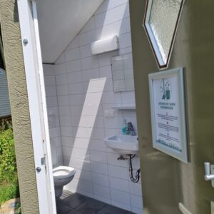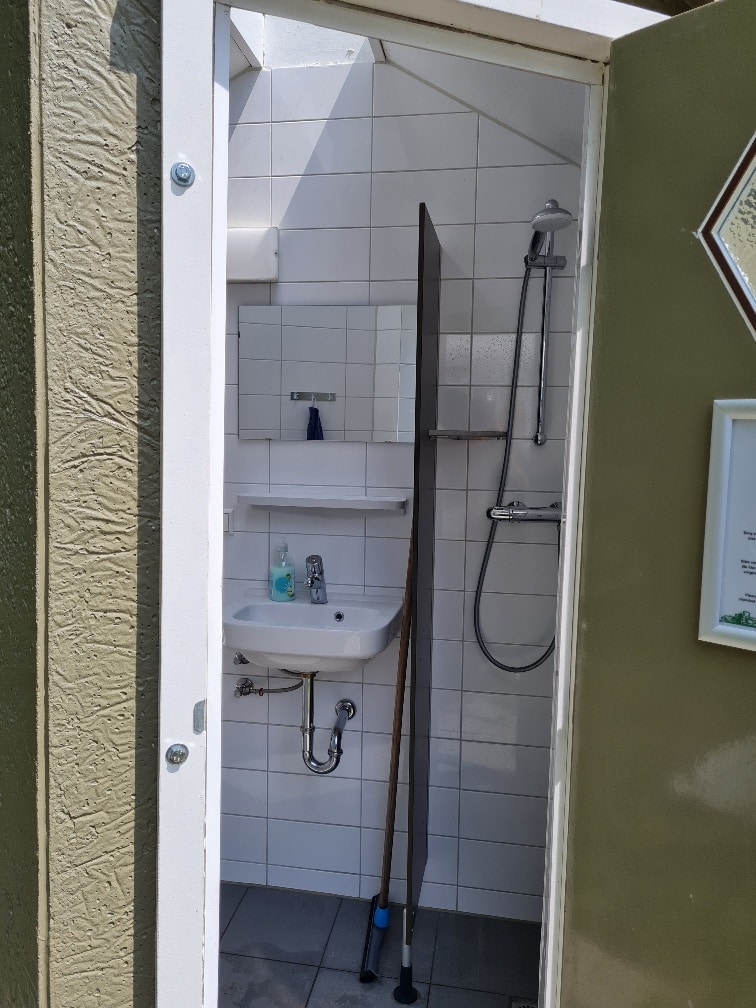 Pal naast onze plek stond een klein huisje waarvan alleen wij de sleutel hadden. Links was er een toilet, in het midden een wastafel en rechts de douche. Klein, maar fijn. Hoe dol ik ook op kamperen ben, sanitairgebouwen vind ik altijd een dingetje. Dat we nu niet hoefden te ‘timen’ wanneer we het beste konden gaan douchen, vond ik heerlijk. Ook fijn: je kunt je douchegel en tandenborstel gewoon laten staan.