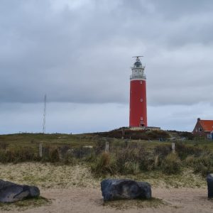 Kamperen in duinen. Op de achtergrond zie je de vuurtoren van Texel.