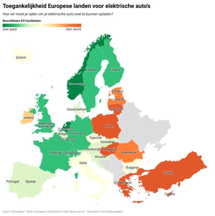 Inmiddels rijden er zo’n 350.000 elektrische auto’s rond in Nederland. Een flink aantal zal deze zomer worden gebruikt voor een buitenlandse vakantie. Nederland is elektrisch goed begaanbaar, maar hoe zit dat met andere Europese landen? Wat is de gemiddelde afstand tot een snellader en hoeveel laadpunten zijn er überhaupt. Energiebedrijf en laadpaalleverancier Zonneplan zocht het uit. Het gebruikte daarvoor onder meer de recente cijfers van de European Alternative Fuels Observatory, het belangrijkste referentieportaal van de Europese Commissie voor alternatieve brandstoffen, infrastructuur en voertuigen.