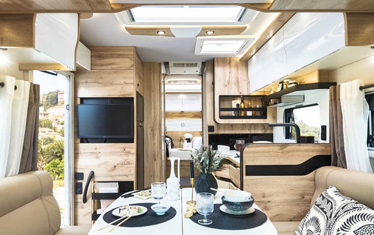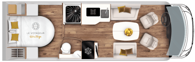 De Le Voyageur Héritage LVXH 7.9 CF integraal is de korte versie van 7,91 meter. Hij heeft achterin een queensbed. Dat heeft een bedmaat van 1,9 bij 1,5 meter. Voorin zien we een zithoek met de populaire face-to-face-opstelling en twee banken tegenover elkaar in lengterichting. Boven de zithoek hangt het hefbed – bedmaat 1,9 bij 1,4 meter – met twee extra slaapplaatsen. Dat hefbed is overigens geen beletsel voor een uit de kluiten gewassen dakluik boven de zithoek.