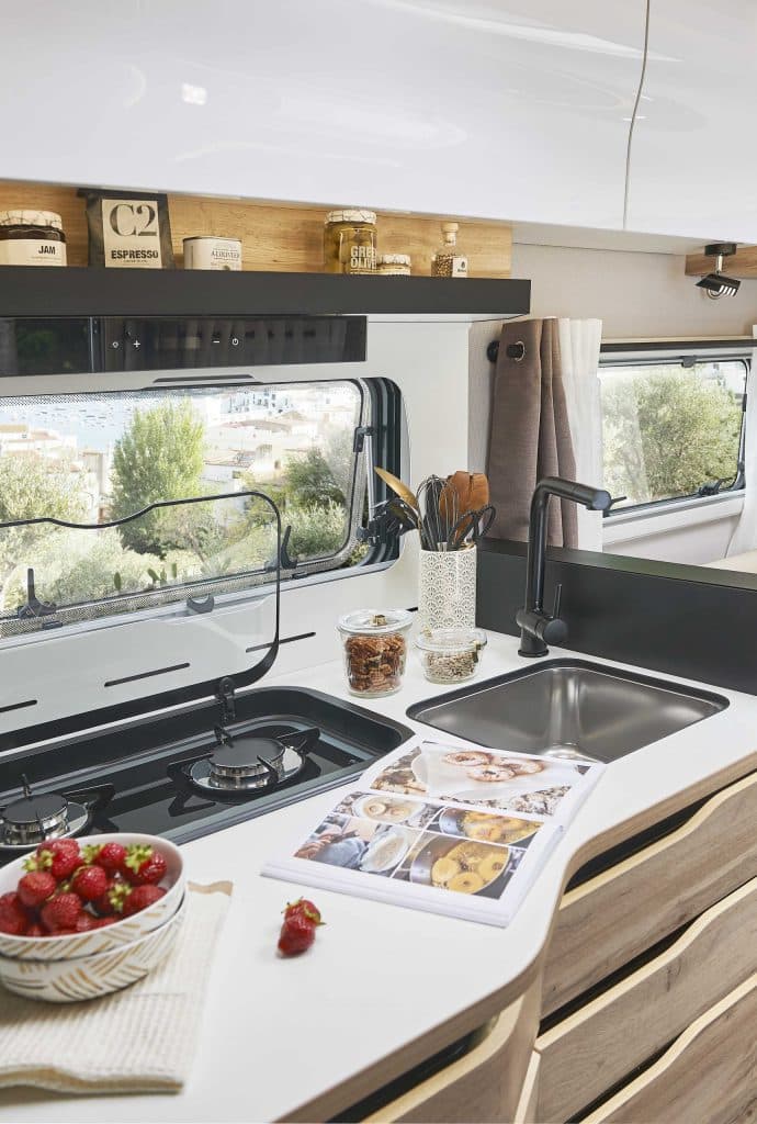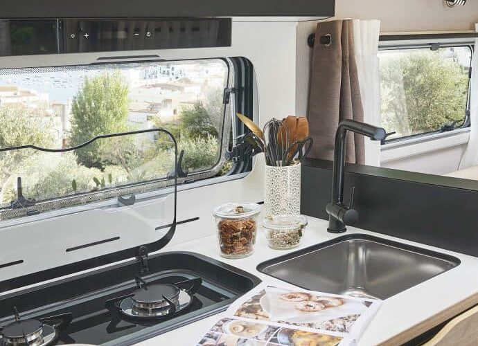De keuken met twee pitten is tegenover de toegangsdeur te vinden. De 153 liter grote koelkast staat er tegenover, meteen naast de deur. Aan opbergruimte geen gebrek in deze keuken. Achter de keuken is plek voor de badkamer, een Raumbad. De separate douche is samen te voegen met de wastafel en het toilet. Zo ontstaat een extra ruime badkamer. Opvallen doen de zwarte kranen en armaturen.
