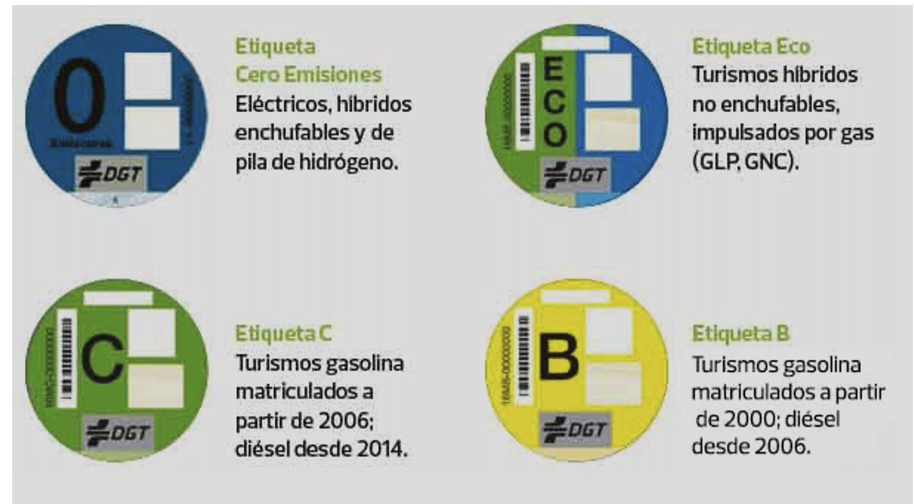 Momenteel hanteert Spanje vier milieustickers: