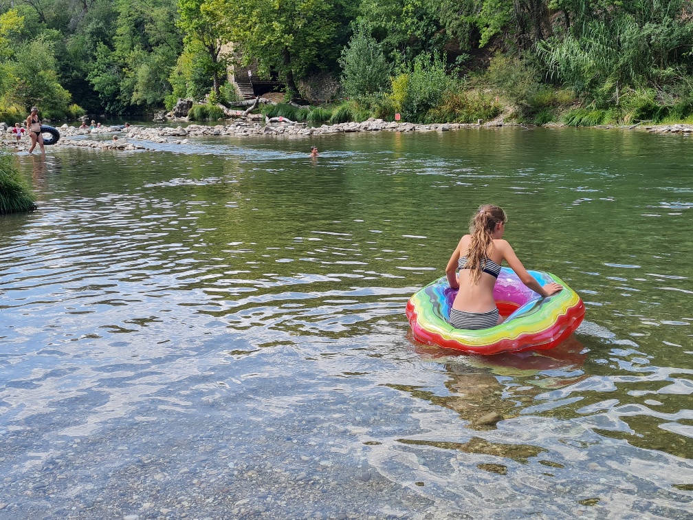 Na een week verkasten we naar camping La Vallée Verte in La Roque-sur-Cèze. Wat hadden we hier een fijne plek. Mét privé sanitair, en dat bleek ik stiekem toch wel ideaal te vinden. La Vallée Verte ligt aan een rivier: met een band de stroming af, springen van de rotsen, dammetjes bouwen. Het was heerlijk!
