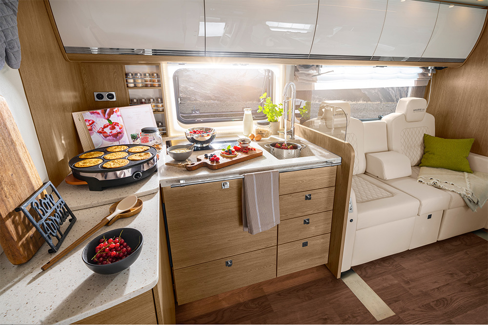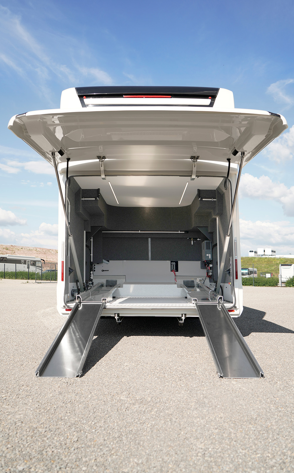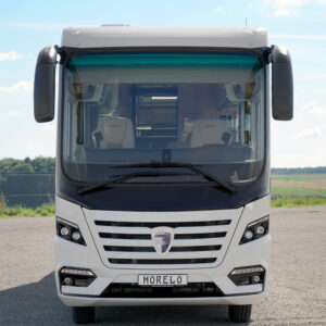 Morelo breidt de Grand Empire-serie, het vlaggenschip van het merk, uit met de Grand Empire 120. De liner komt in twee indelingen: de 120 GSB en de 120 GSO met slide-out. Met zijn lengte van 12 meter, gewicht van 26 ton en een laadvermogen van 11.300 kilogram maakt de Grand Empire, die in Düsseldorf zijn wereldpremière beleeft, indruk. Hij staat op de Mercedes Actros die een 530 pk-motor met 12,8 liter cilinderinhoud, een twaalftrapsautomaat en maar liefst drie assen heeft. Achterin de camper een autogarage waar bijvoorbeeld een Mini Cooper in past.