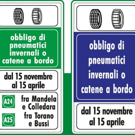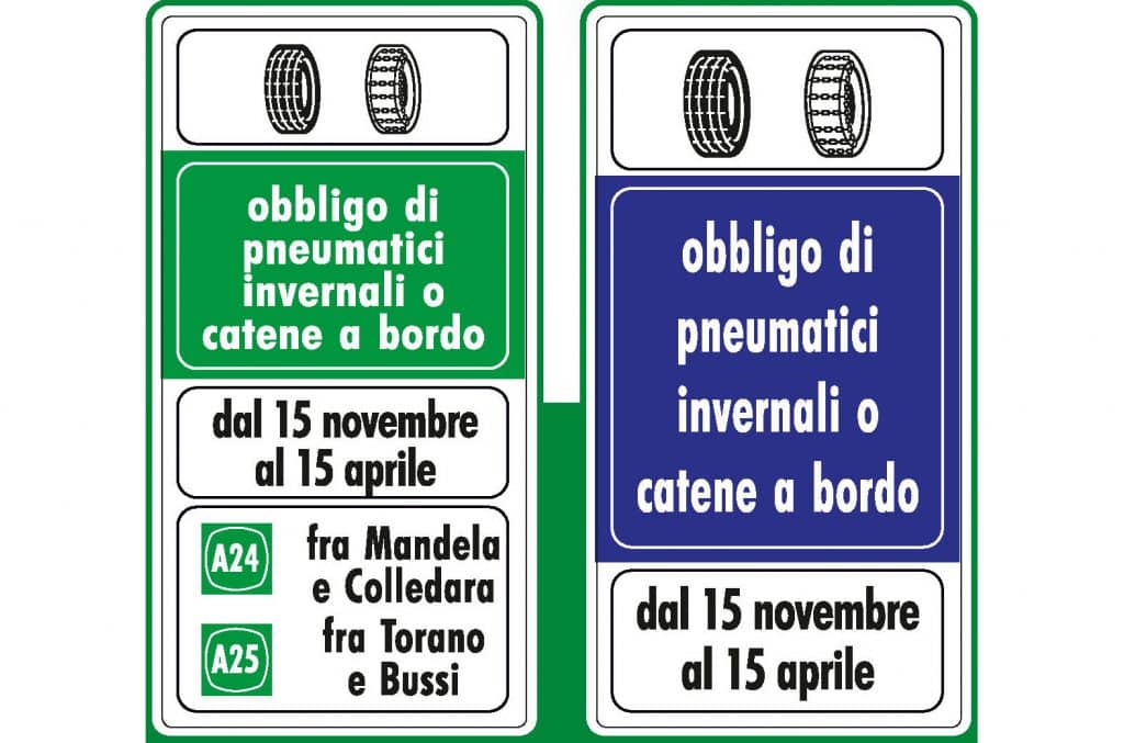 - Winterbanden zijn globaal verplicht van 15 november tot en met 15 april. Dit in bepaalde gebieden en op bepaalde wegen. Aangegeven door een groen of een blauw bord. Daarop staat de tekst obbligo di pneumatici invernali o catene a bordo (foto onder deze tekst). Oftewel winterbanden of sneeuwkettingen aan boord verplicht. Tenzij er sneeuwkettingen in het voertuig aanwezig zijn.