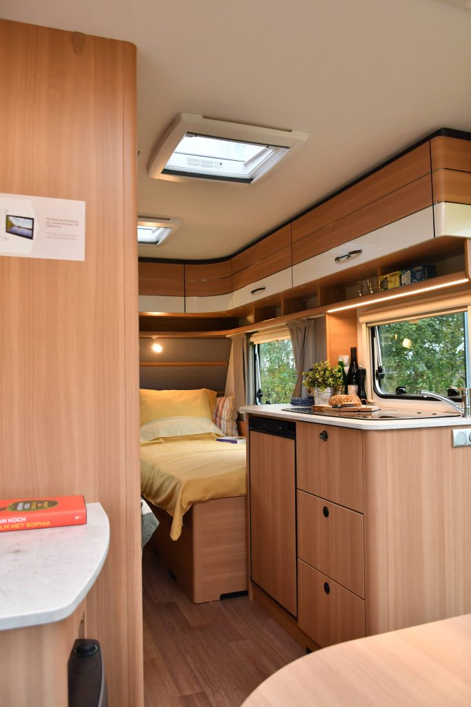 Naast de enkele bedden en de treinzit heeft de caravan natuurlijk nog meer te bieden. Zo bevindt zich in het midden een ruime keuken met een driepits kooktoestel en een geïntegreerde spoelbak. De lades zijn voorzien van een softclose-sluiting en er is natuurlijk een riante koelkast. Tegenover de keuken vind je een badkamer met wastafel en ingebouwd cassettetoilet.