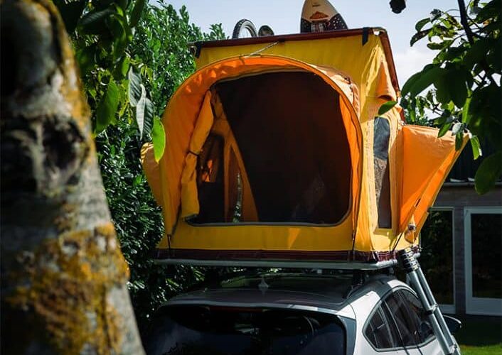 De basistent is zwart met een antracietkleurig dak. De opvallende kleuren van het prototype op de foto’s komen wellicht nog wel terug. Roland: “We denken er aan om in eerste instantie de luifelsets in verschillende kleuren aan te beiden. En wellicht komt er nog een felgekleurde Aniewhere-daktent. We gaan eerst eens polsen wat mensen mooi vinden. Dat doen we ook op de Kampeer en Caravan Jaarbeurs, waar we bezoekers vragen welke kleur hen aanspreekt.”