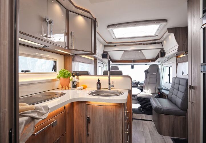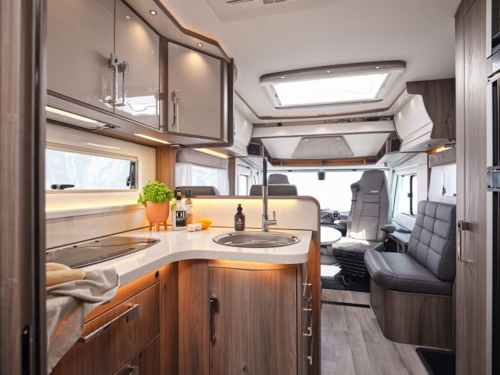 Die laatste twee krijgen er een nieuwe indeling bij: de i790 LQB. Deze wordt aangeboden in de 790-modellen en heeft een riant queensize bed. Boven de voorstoelen is een hefbed, dus als je de dinette ombouwt kun je er met vijf personen in slapen. Verder heeft deze indeling een apart toilet, een douche en een compleet uitgeruste hoekkeuken.