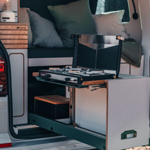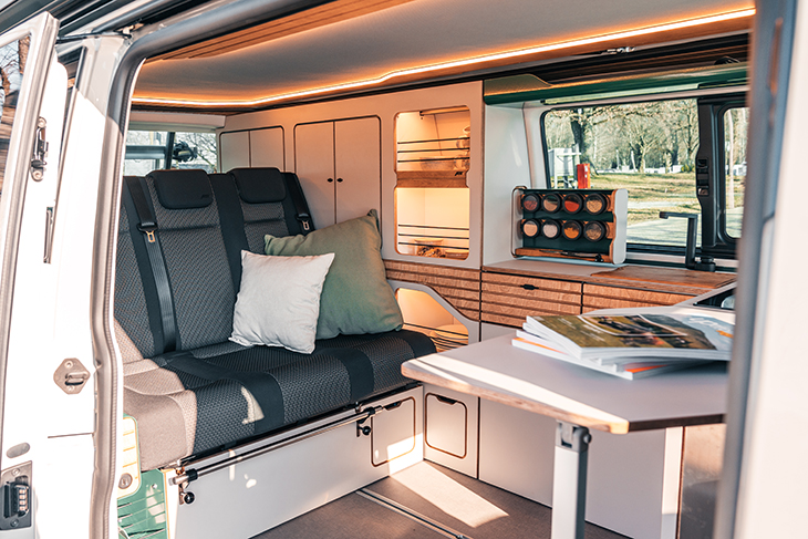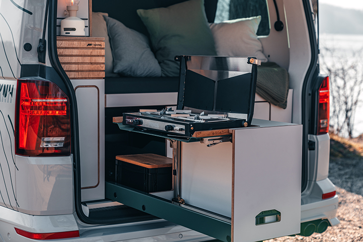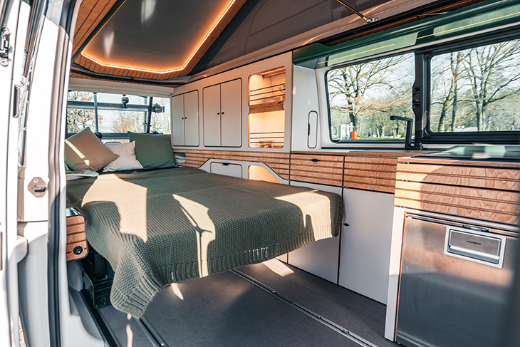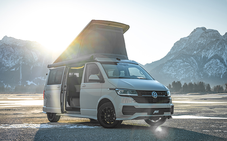 De naam ABT komt van de oprichter van het familiebedrijf, maar waar komt dat XNH vandaan? Hans-Jürgen Abt van het Duitse bedrijf legt het uit: “De naam ABT XNH staat voor explore new horizons. Wij richten ons tot al diegenen die hun horizon willen verbreden en voor wie maximaal comfort de ultieme vorm van vrijheid is. Zowel in het dagelijks leven als in hun vrije tijd.” Voor die ontdekkingstocht naar nieuwe horizonten ontwikkelde ABT een sportieve campingbus op de VW T6.1 met een 150 pk-motor. Aan de buitenzijde – die de kleur Ascot Grey heeft – valt de grafische striping op, evenals zwarte 18 inch XNH-wielen, die speciaal voor de campingbus zijn ontworpen. De robuuste wielen passen perfect bij de Goodyear Eagle F1-banden. Een Thule Omnistor 4200-luifel en een Thule-fietsendrager, die je op de foto’s ziet, zijn als optie verkrijgbaar.