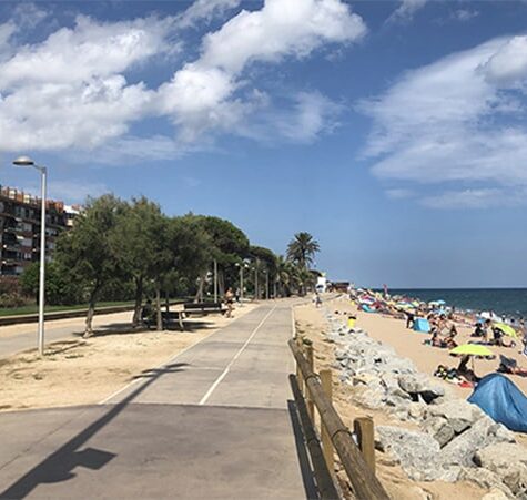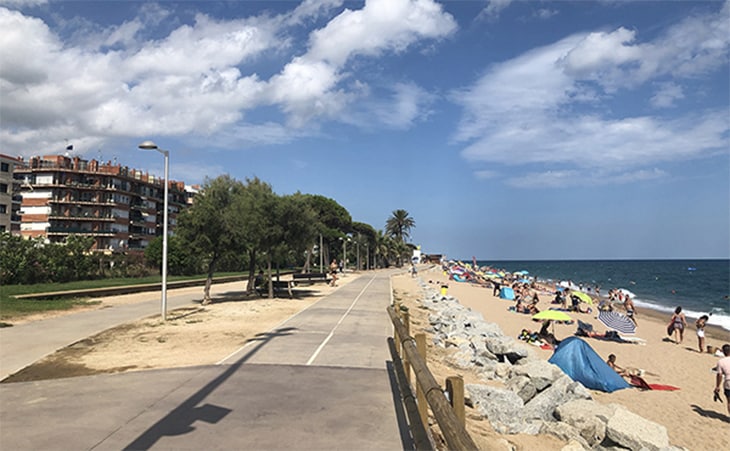 En dan het strand. Daar loop je vanaf de camping in ongeveer drie minuten heen. Even een tunneltje door en je staat aan een lange boulevard die onder meer richting Calella gaat.