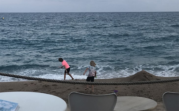 Aan de boulevard ligt ook ons favoriete strandtentje: Tiaré. Hier komen we op onze eerste avond terecht. Tijdens het eten zit je hier heel gezellig en vervolgens kan je met je voeten in het zand nog een cocktail aan zee drinken. Het eten is op de eerste avond heel lekker en op de volgende avonden gewoon prima. Niet heel bijzonder. Het is een beetje saai, maar tijdens ons verblijf in Pineda de Mar gaan we – als we uit eten gaan – alleen maar naar Tiaré. De zonsondergang in zee, de jongens die fijn in het zand spelen, de lekkere sangria en cocktails: het is gewoon super.