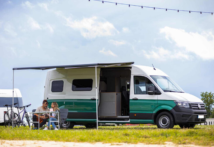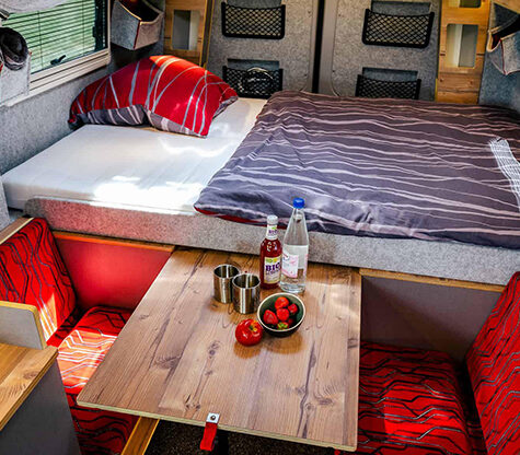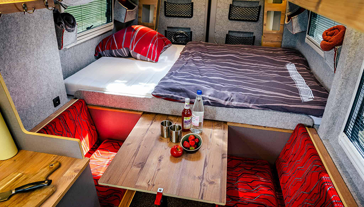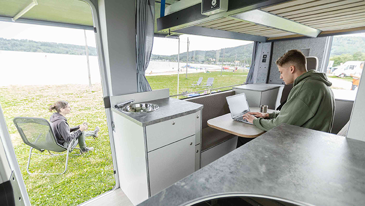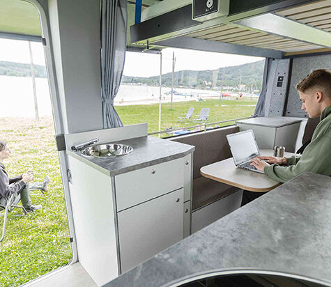 Tot de cabine-uitrusting behoren onder meer een achteruitrijcamera, airconditioning, een eCall noodoproepsysteem, een multifunctioneel lederen stuur, stoelverwarming voor beide stoelen, cruise control, en elektrisch verstelbare en verwarmde buitenspiegels. Van de driezitsbank in de campingbus is een bed te maken. Verder is de bus voorzien van onder meer een keukenblok met kookvoorziening, een gootsteen, jerrycans voor vers- en afvalwater en een compressorkoelkast van 42 liter.