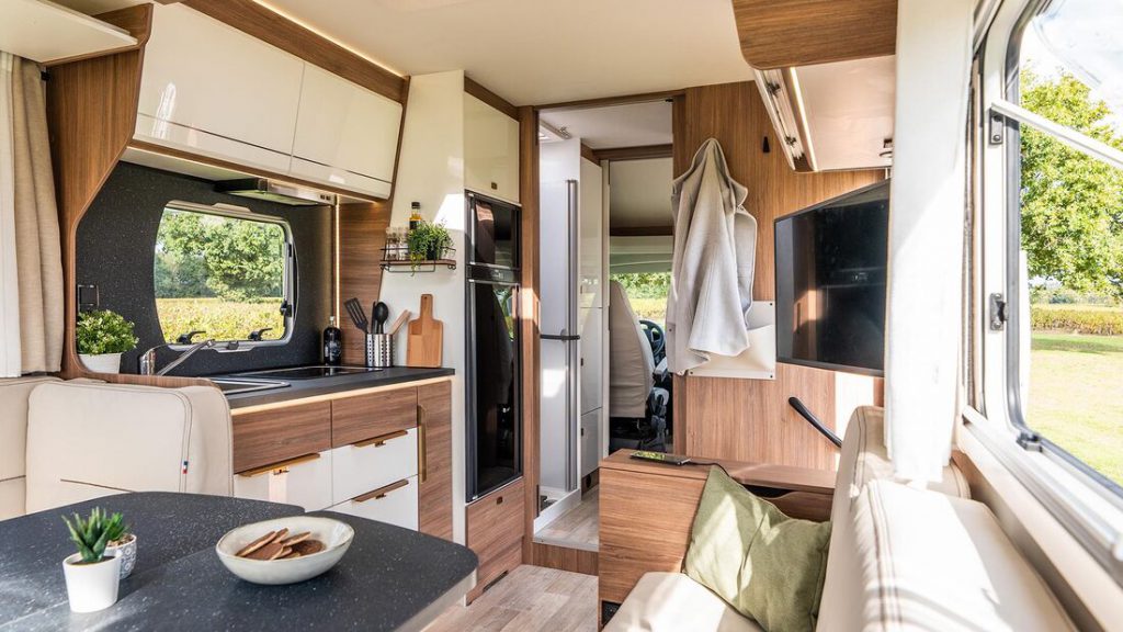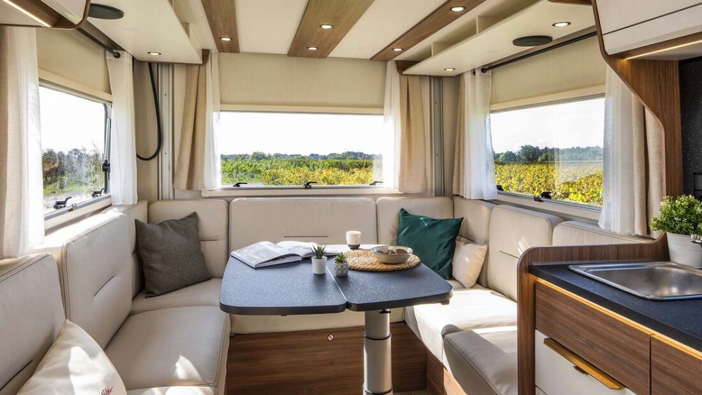 Pilote 2022 gokt met de nieuwe halfintegraal Pacific P 696 U (foto boven artikel) op een indeling met een grote zithoek aan de achterkant. De tijd dat het Franse koperspubliek dat niet zag zitten, lijkt voorbij. Waarschijnlijk heeft Pilote bij zustermerk Frankia afgekeken. Daar doen deze indelingen het namelijk ook steeds beter. De Pacific P 696 U beschikt – zoals we dat al eerder ook bij Frankia zagen – over een hefbed boven de zithoek. Ook bijzonder: tussen het keukenblok en de cabine een badkamer over de volledige breedte van de camper. De vanafprijs van de P 969 is zo’n 70.000 euro.
