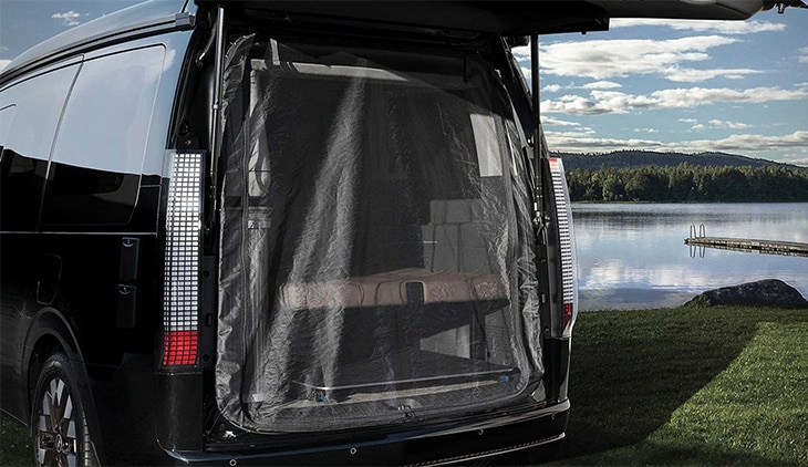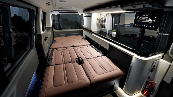 Het interieur van de Staria Lounge Camper verschilt enigszins van de andere multifunctionele MPV’s. Hier geen strakke zwarte bekleding, maar luxe ogende stoelen en banken in een bruine kleur. Led-verlichting maakt het sfeervol in de donkere uurtjes. In het keukenblokje aan de bestuurderszijde is ruimte voor een koelbox van 36 liter en een spoelbak. Ook zijn hier de verswatertank (70 liter) en de afvalwatertank (40 liter) weggewerkt. De tafel krijgt een plekje tegen de zijkant van het blok en is naar wens tevoorschijn te halen. Wie even wil douchen, kan daarvoor de uittrekbare douchekop in de keuken gebruiken en buiten naast de auto gaan staan.