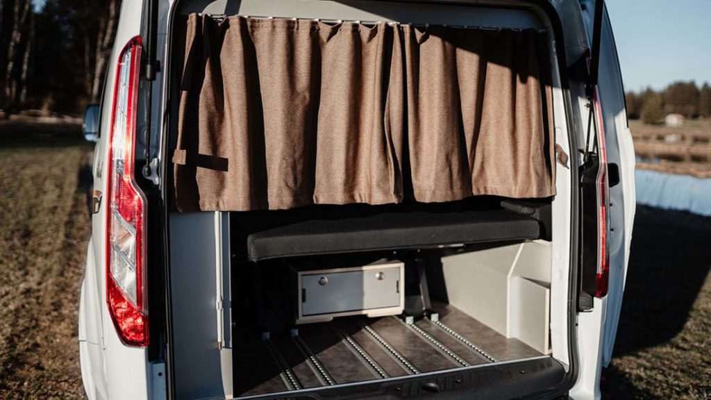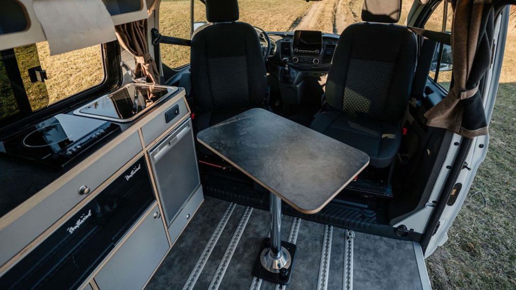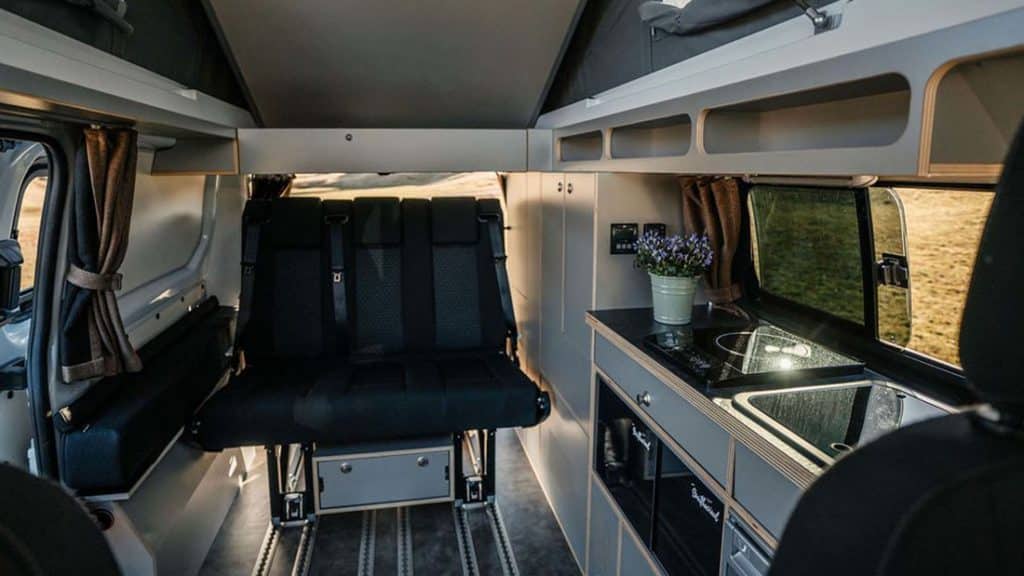 De keuken doet het zonder gasfles. Koken doe je op inductie. Al krijg je er ook een éénpitter met een gascartouche bij, voor als je buiten wilt koken. Het keukenblok biedt opbergruimte. Verder is er een koelkast met 40 liter inhoud en een wasbakje met een jerrycan. Naast de koelkast is er optioneel – meerprijs 130 euro – een vak voor een mobiel toilet. De hoge kast voor kleding is als hang- of legkast te bestellen. De slaapbank heeft overdag drie zitplaatsen met gordel te bieden en is verschuifbaar. Hij kan er zelfs helemaal uit. Wil je er nog twee extra stoelen bij, dan kost dat 830 euro.