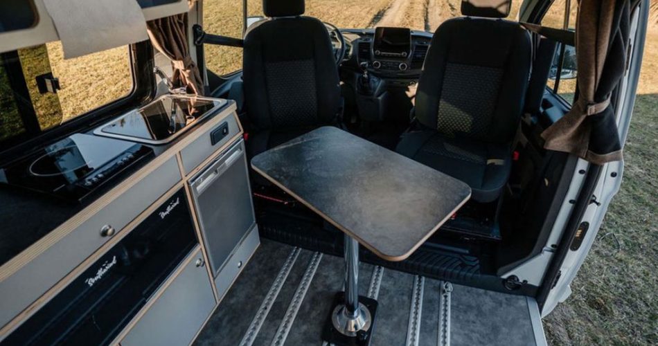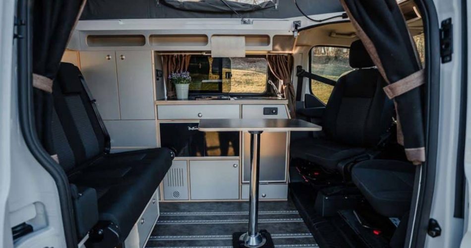 Om hem helemaal naar je zin te maken, kun je de kleur van de striping op de standaard witte buitenkant zelf kiezen. Ook een kleurtje in het interieur kun je naar eigen smaak laten aanpassen. De camperbouwer uit het Duitse Füsen heeft twee modelvarianten in de aanbieding: de Allrounder en de Camper. De eerste heeft een slaapbank over de gehele breedte en verder weinig meubels. De tweede is meer een klassieke buscamper, compleet met keukenblok. We zien grijze oppervlakten en houten frames. Het geheel doet modern aan.