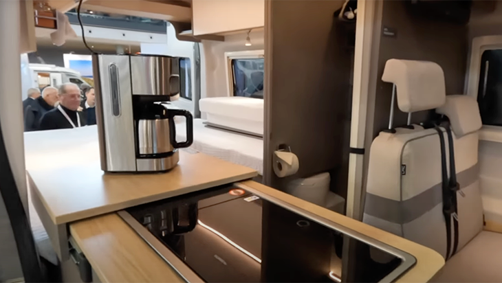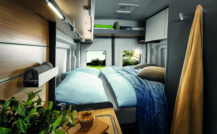 De ruimte voor enkele bedden in een korte buscamper moet ergens vandaan komen. LMC speelt in het studiemodel daarom met de ruimte van de keuken en de badkamer. Het compacte keukenblok heeft een uitschuifbaar werkblad. Wanneer de keuken in gebruik is, schuift het rechterdeel van het blad over de bedden. Dit gedeelte heeft een draaglast van 40 kilo en is dus bijvoorbeeld geschikt voor een koffieapparaat. Is de keuken niet in gebruik? Dan schuift het blad terug over de rest van het keukenblok. Onder het bed is nog een uittrekbare voorraadkast te vinden. Het sanitair is klein, maar functioneel. Alles is aanwezig: een douche, toilet en wastafel. Is het tijd om te douchen, dan schuift het draaibare toilet in een opbergruimte onder het bed en klapt de wastafel tegen de wand. Beide zijn makkelijk weer terug te halen. De enkele bedden achterin hebben een afmeting van 2,02 x 0,74 cm en 1,81 x 0,73 meter. Ze zijn ook samen te voegen tot een tweepersoonsbed van 2,02/1,81 x 1,88 meter. Eronder is ruimte om bagage op te bergen. Tijdens de reis is het middendeel weg te klappen, waardoor plek ontstaat om bijvoorbeeld fietsen mee te nemen.