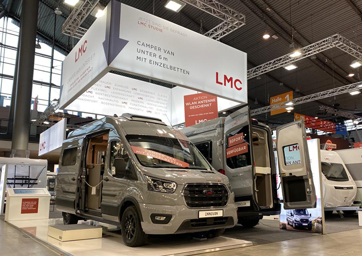 Op de CMT presenteerde LMC ook een nieuwe uitvoering van de Innovan 590, de eerste LMC-buscamper op Ford, die vorig jaar werd geïntroduceerd. Om deze camper ook toegankelijk te maken voor langere kampeerders, heeft LMC de Ford nu zogenoemde ‘wangen’ aan de achterzijde gegeven. Het resultaat zie je op de foto hierboven. Hierdoor ontstaat ruimte voor een grote dwarsbed, dat een oppervlak van 1,48 x 2,02 meter heeft. Dat is een stuk breder dan het bed in de eerdere Innovan 590, waar het dwarsbed 1,90 meter was.
