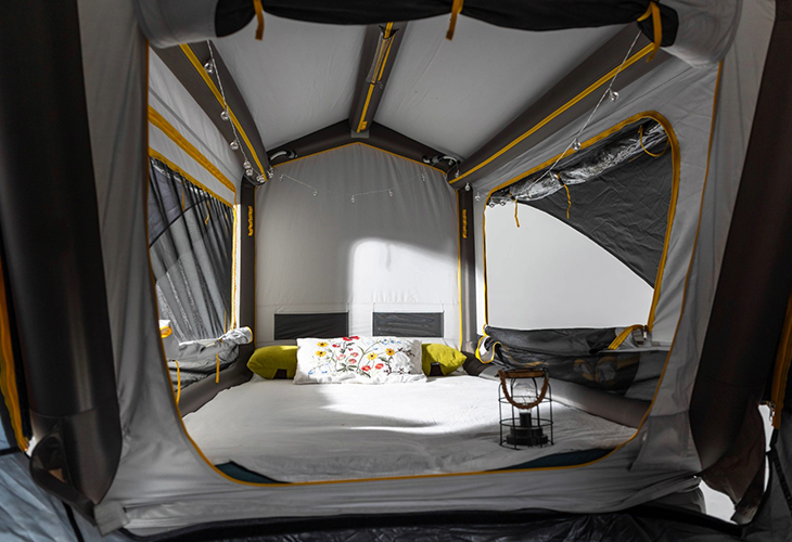Deze stevige opblaasbare tent heeft een binnenhoogte van 150 centimeter. In de tent zelf is een matras van 125 x 200 centimeter te vinden. De ramen rondom zijn allemaal voorzien van horrengaas. De wanden hebben opbergzakken waar je kleine spullen in kunt bewaren.