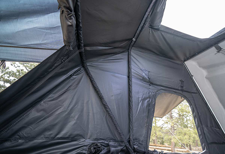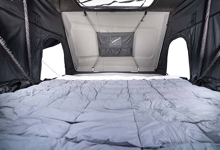 Het zelfopblazende matras is 5 centimeter dik. Kampeerders slapen onder een lakenset van bamboe, die tot de all in-uitrusting van de Roofnest Condor 2 XXL Air behoort. Een organizer met zes vakken biedt plek aan kleine spullen, zoals een telefoon, e-reader of bril. Ook voor schoenen zijn er aparte zakken.