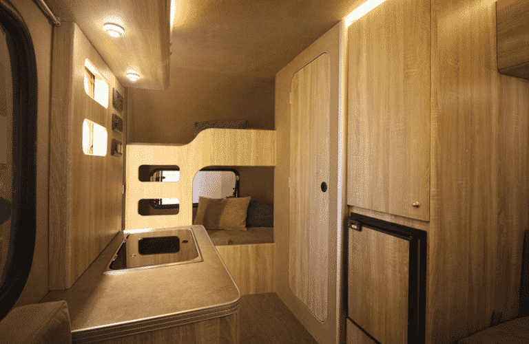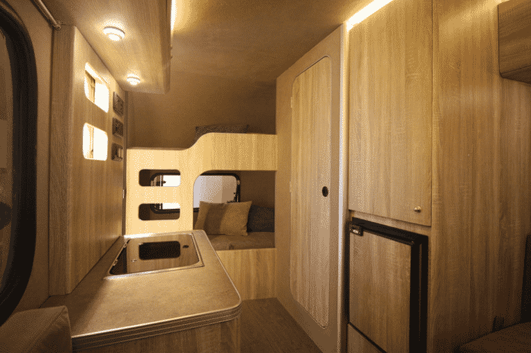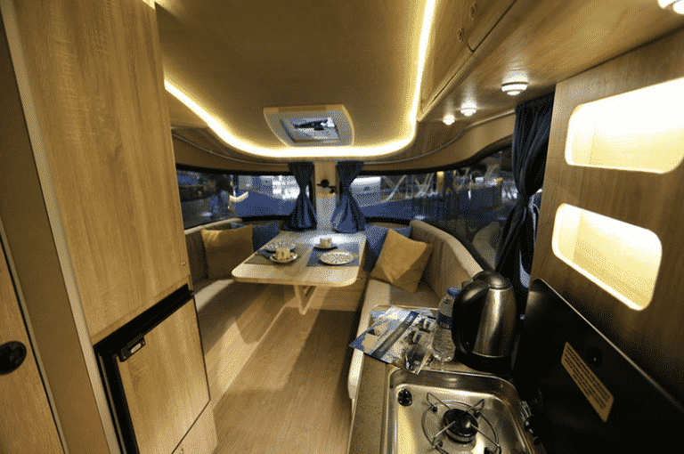 Deze compacte caravan lijkt in de verte een beetje op de kleine Basecamp Airstream. Dat komt vooral door het in het oog springende raam aan de voorkant. Dat is donker getint en loopt aan beide kanten van de caravan door in de zijkant. Het loopt de hoek om zogezegd. En dat ziet er goed uit. In tegenstelling tot de kleine Airstream heeft de Carpento de deur gewoon aan de zijkant. In de achterkant een klein raam en een luik. Daarachter een handige opbergplek voor buitenspullen. Voorin zien we een knus zithoekje. Hier heb je rondom uitzicht, dankzij het opvallende raam. Door de afgeronde hoeken van de bankjes (foto onder deze tekst) moeten we hier weer denken aan een Eriba. De Carpento caravan heeft daarmee best een flinke portie cult in zijn ontwerp. Je hoeft je voor dat soort gelijkenissen als compacte caravan zeker niet te schamen.