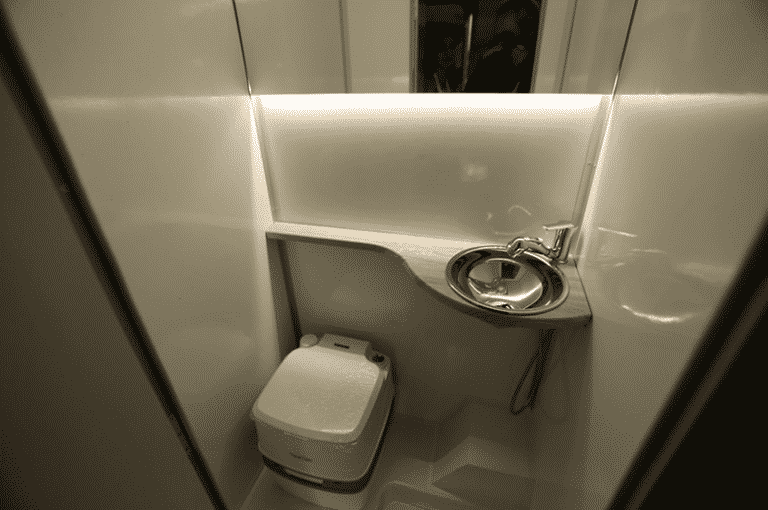 Badkamer met wastafel en porta-potti.