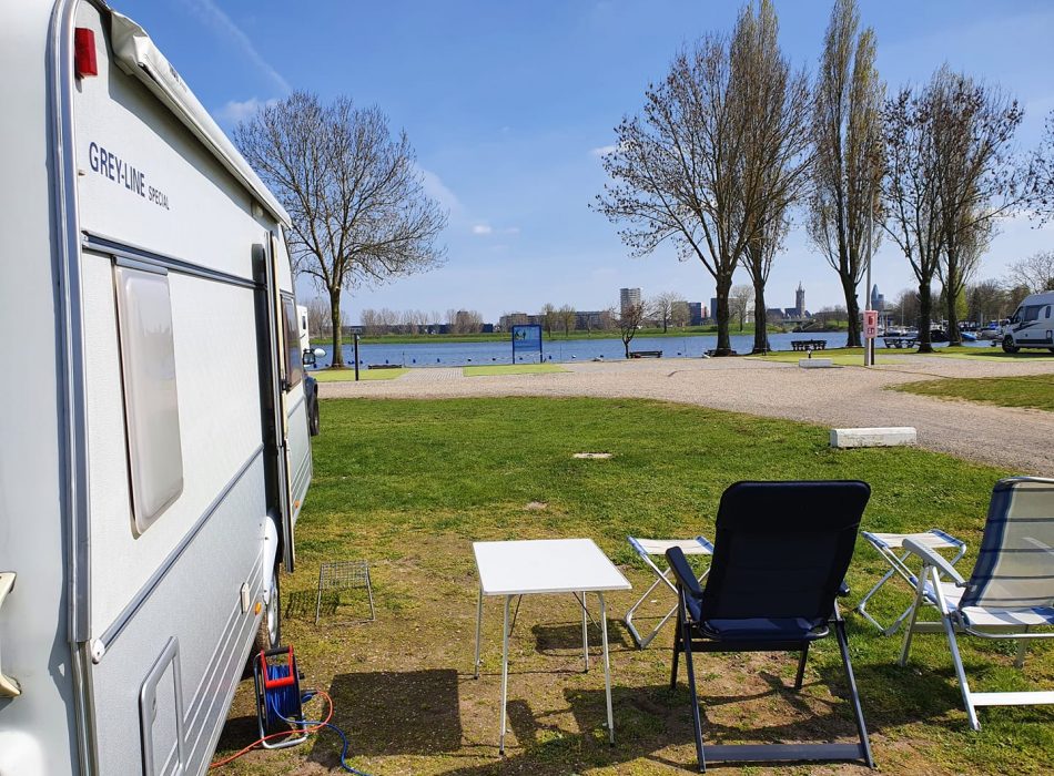 Om de Enduro BC 260 fietsendrager en de rest van onze Kip caravan uit te proberen, trekken we richting Roermond. We hebben daar een camping aan het water op het oog. Aangezien de terrassen toch nog niet open gaan, kiezen we voor een camping met een frituurwagen voor de poort. Scheelt een dag koken. Camping Velmans ligt midden tussen de Maasplassen. Dus dat fietsen zien we helemaal zitten. De camping – met 150 plaatsen – heeft een eigen zwemstrand en een flinke ligweide direct aan het water. Voor de auto’s is er een centrale parkeerplaats. Geen heen en weer rijdende buren dus. We betalen er 25 euro per nacht. We krijgen een plek op een hoek en kijken uit over de plas (zie foto boven het artikel). De zon brandt flink, we moeten zelfs smeren. De wind is fris.
