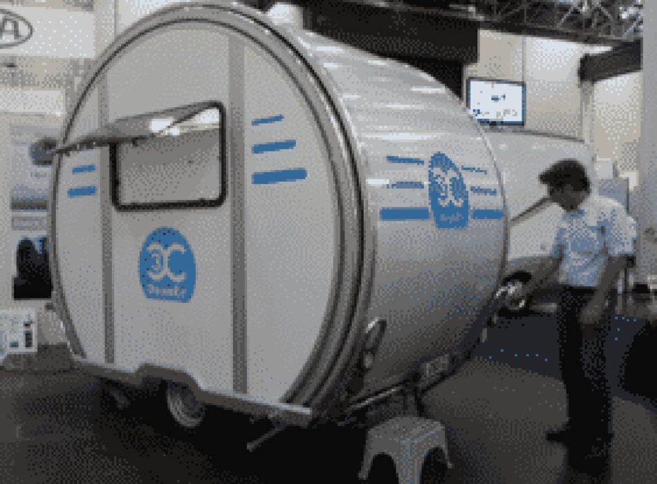 Klein en compact achter de auto, een dopje, meer is het niet. Eenmaal op de camping draai je aan een sleuteltje en begint hij uit te schuiven totdat hij drie keer zo groot is geworden. Zie hier de 4 persoons BeauEr.