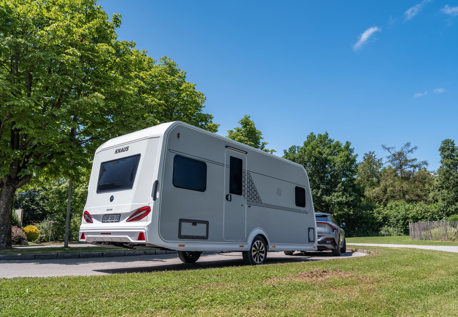 Ook de nieuwe Knaus Azur dingt mee naar de titel. De zelfdragende constructie van deze herintreder in het topsegment is gebouwd op een chassis met een geïsoleerde vloer. Dit fibre frame bestaat uit 22 delen die met uiterste precisie door robotarmen aan elkaar zijn verlijmd. Het frame is uv-bestendig en volgens Knaus ook zelfherstellend. Dit betekent dat deukjes en krassen, bijvoorbeeld door contact met steentjes of een boomtak, zullen verdwijnen door blootstelling aan warmte. Bijzonder aan het interieur is de smart wall: een met stof bekleed oppervlak aan de wand waarachter een opbergruimte schuilgaat.