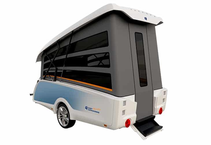 Wie ’s nachts wat meer ruimte wil hebben, kan ervoor kiezen om niet alle kussens van het semi-vaste bed neer te leggen. Door er in het midden eentje weg te laten, ontstaat een klein gangpad. Hierdoor is het nóg makkelijker om uit bed te stappen. Door het bed omhoog te tillen, is de grote bagageruimte bereikbaar. Net als bij de eerste TakeOff met langszit is ook deze indeling naar eigen wens in te richten. Bijvoorbeeld met een uitneembare keuken die zowel binnen als buiten is te gebruiken, een koelbox en een portable toilet dat onder de bank zit verstopt.