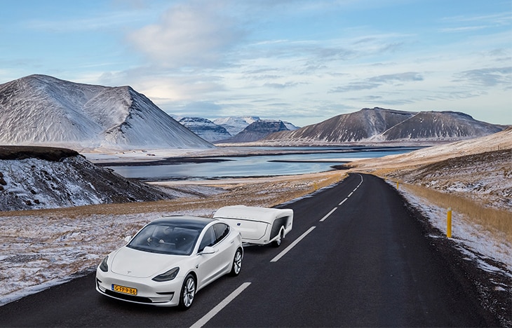 Intussen staat de TakeOff 2022 in steeds meer Nederlandse showrooms. Een voorproefje van de nieuwe indeling was afgelopen oktober al te bewonderen op de Kampeer en Caravan Jaarbeurs in Utrecht. Deze tweede plattegrond biedt de TakeOff 2022 een semi-vast bed dat heel flexibel te gebruiken is. In zijn geheel heeft dit bed een kingsize-afmeting van 2,05 x 1,60 meter. Door het bed iets naar achteren te schuiven op de lattenbodem, rugkussens op de stoelen te plaatsen en de tafel tevoorschijn te toveren, ontstaat aan het voeteneinde van het bed een zithoek. Zo zijn het bed en de treinzit dus tegelijkertijd te gebruiken.