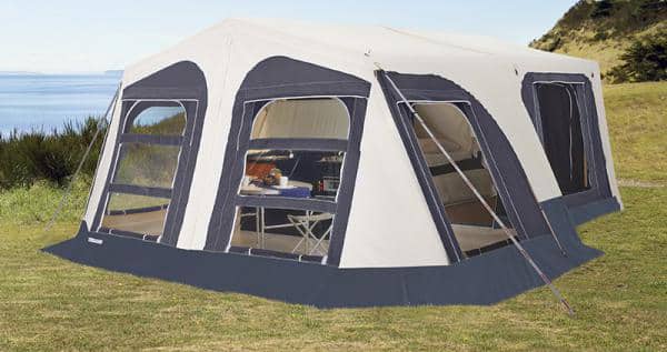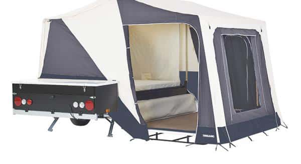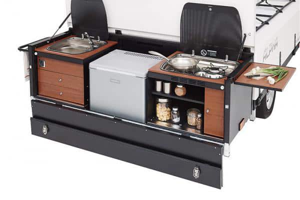 Een zwarte aanhanger doet dienst als onderkomen voor de Trigano Alpha Limited Edition. Deze aanhanger heeft een maximaal totaalgewicht van 750 kilo en een leeggewicht van 460 kilo. Het laadvermogen komt daarmee op 290 kilo. De wagenbak van deze Alpha GL heeft een lengte van 3,20 meter. Inclusief de dissel is hij 4,35 meter lang. De aanhanger is 1,71 meter breed en 1,05 meter hoog. De witte deksel is uitgerust met een zwart geïntegreerd bagagerek. Bij het opzetten klapt het bagagerek als eerste naar beneden, waarna de deksel volgt. Die doet vervolgens dienst als vloer. Met het openklappen van de deksel komt de tent vanzelf mee en dus is de slaaptent binnen enkele minuten gereed. Dat is wel zo handig voor een snelle overnachting of voor kampeerders die niet kunnen wachten om in hun campingstoel te relaxen.