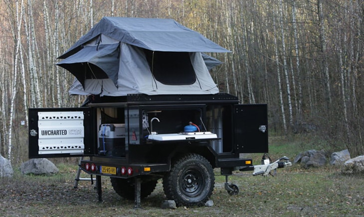 Uncharted Offroad Trailers (UOF) komt uit Nederland. In Moerdijk worden de trailers ontworpen en vervolgens met hoogwaardige materialen geproduceerd. Met een daktent erop, heb je een stoere offroad-tenttrailer. Het chassis van alle trailers is gedeeltelijk van rvs met een subframe van gegalvaniseerd staal, en heeft een poedercoating. Verder zijn ze onder meer voorzien van een onafhankelijk geveerde wielophanging, een universele dakdrager (voor bijvoorbeeld die tent), led-verlichting, een geremde trekhaakkoppeling en twee sterke uitschuifbare poten.