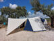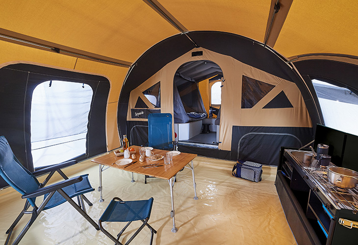 Onder de bedden is aan elke kant nog ruimte om een ondertent op te hangen. Hier kunnen bijvoorbeeld vier kinderen slapen; in elk tentje twee. De optionele ondertent is ook handig om als extra bagageruimte te gebruiken.
