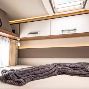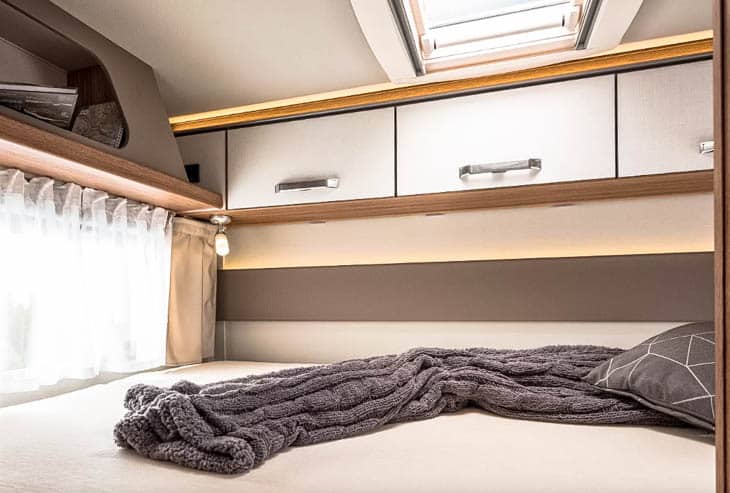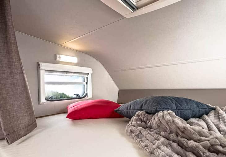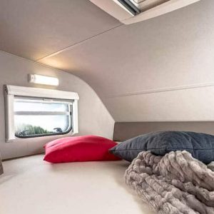 Oké, de indeling is niet spannend. Eerder het gebruikelijke, maar daar is eigenlijk helemaal niks verkeerd aan. Voorin het woongedeelte met twee draaibare cabinestoelen, een dinettebank en een tafel in twee delen. Hierdoor kan iedereen tijdens het eten bij zijn bord. Klap hem ’s avonds na het eten weer gedeeltelijk in en er is weer meer bewegingsruimte. Onder het bed achterin de garage. Deze heeft een afmeting van (lbh) 2,18 x 0,95 x 1,32 meter. Aan elke kant van de alkoofcamper een toegangsluik.