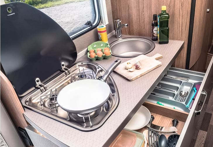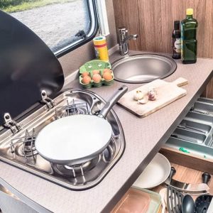 Het werkblad van het keukenblok is te vergroten door een opklapbare plank te gebruiken. Er zijn drie pitten tot je beschikking. De koelkast heeft een inhoud van 106 liter. De watertanks zitten onder de vloer verborgen. Ze zijn optioneel verwarmbaar en geïsoleerd. Water vullen gaat via de travelbox, waar alle aansluitingen samen komen. Het dak van de Weinsberg alkoof camper is van gfk, de wanden van gladde 31 millimeter dikke sandwich aluminiumplaat. Deze zijn versterkt door een raamwerk van hout.