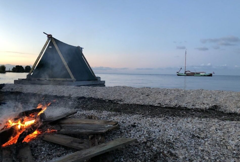 “Het idee heb ik opgedaan in Zweden. Hier kun je met boomstammen een eigen vlot bouwen en daarmee een of meerdere dagen de rivier afdalen. Ondanks dat ik dit nooit in Zweden heb gedaan leek het me erg leuk om dit zelf hier in Nederland te doen. Ik bouwde een vlot, maar moest nog een goede tent maken. Daarom bestelde ik spullen, kocht een naaimachine en zat er vervolgens een jaar tegenaan te kijken. Een tent maken is toch echt een vak, ontdekte ik. Omdat ateliers niet stonden te springen om een tent te maken, vroeg ik mijn buurvrouw – die kleding naait – of ze dit wilde doen. Zo is de eerste versie ontstaan.”